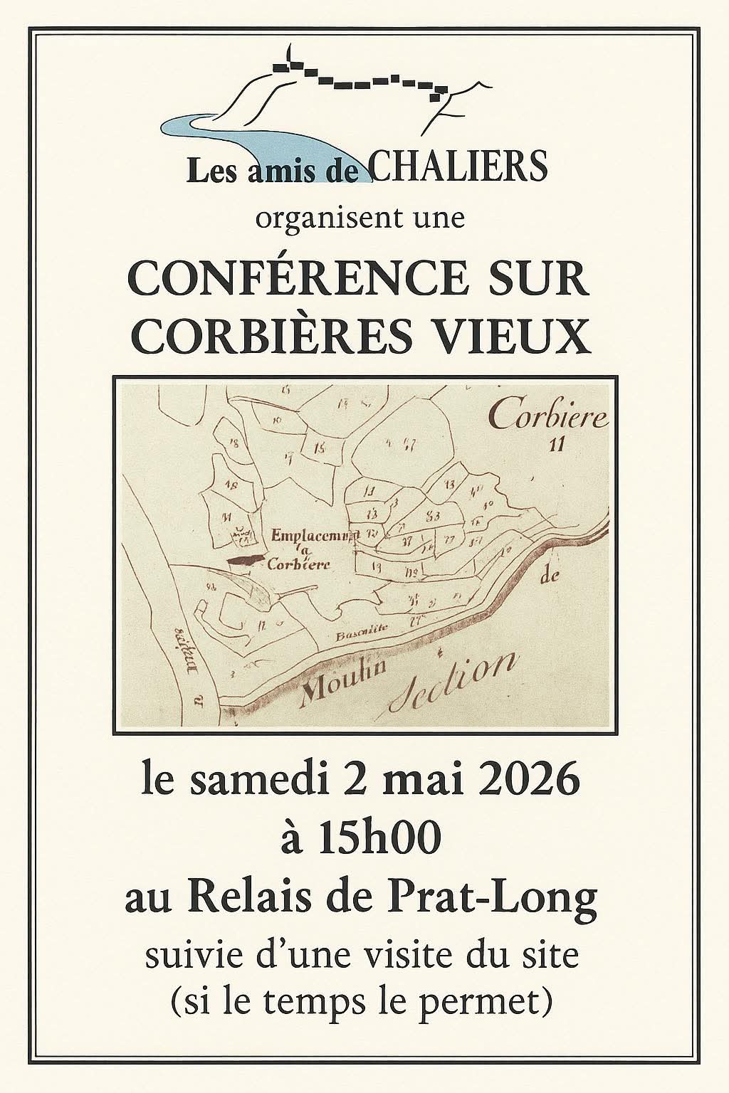 Les Amis de Chaliers vous attendent nombreux le samedi 2 mai 2026 à 15h à Pratlong pour une conférence sur l'histoire de l'ancien village de Corbières-Vieux, niché dans la côte face à Chaliers du côté du ruisseau La Ribeyre.