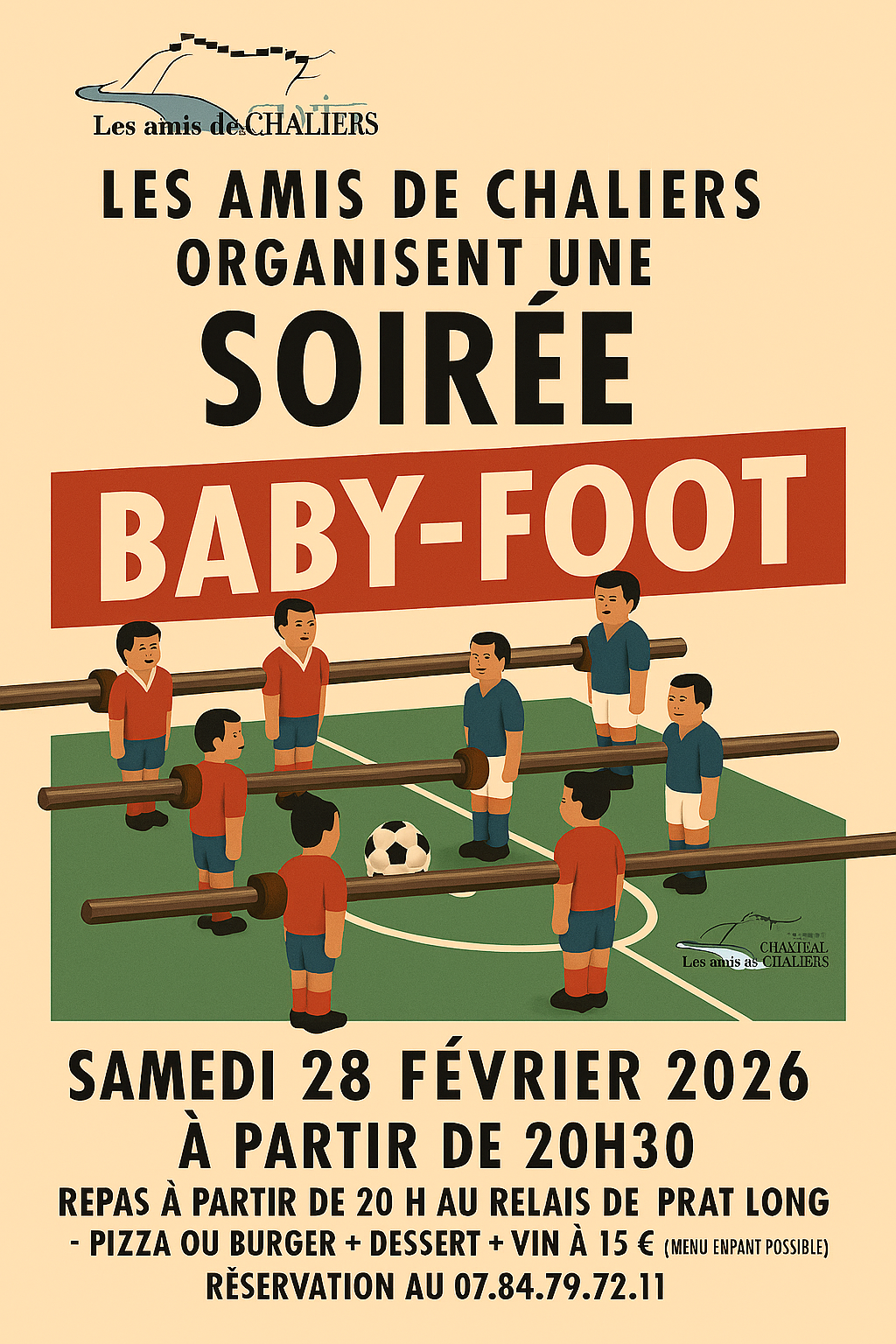 Pratlong SOIREE BABY FOOT samedi 28 février 2026 à Pratlong à 21h Possibilité de repas avant la soirée pour ceux qui le souhaitent à 15 [...]